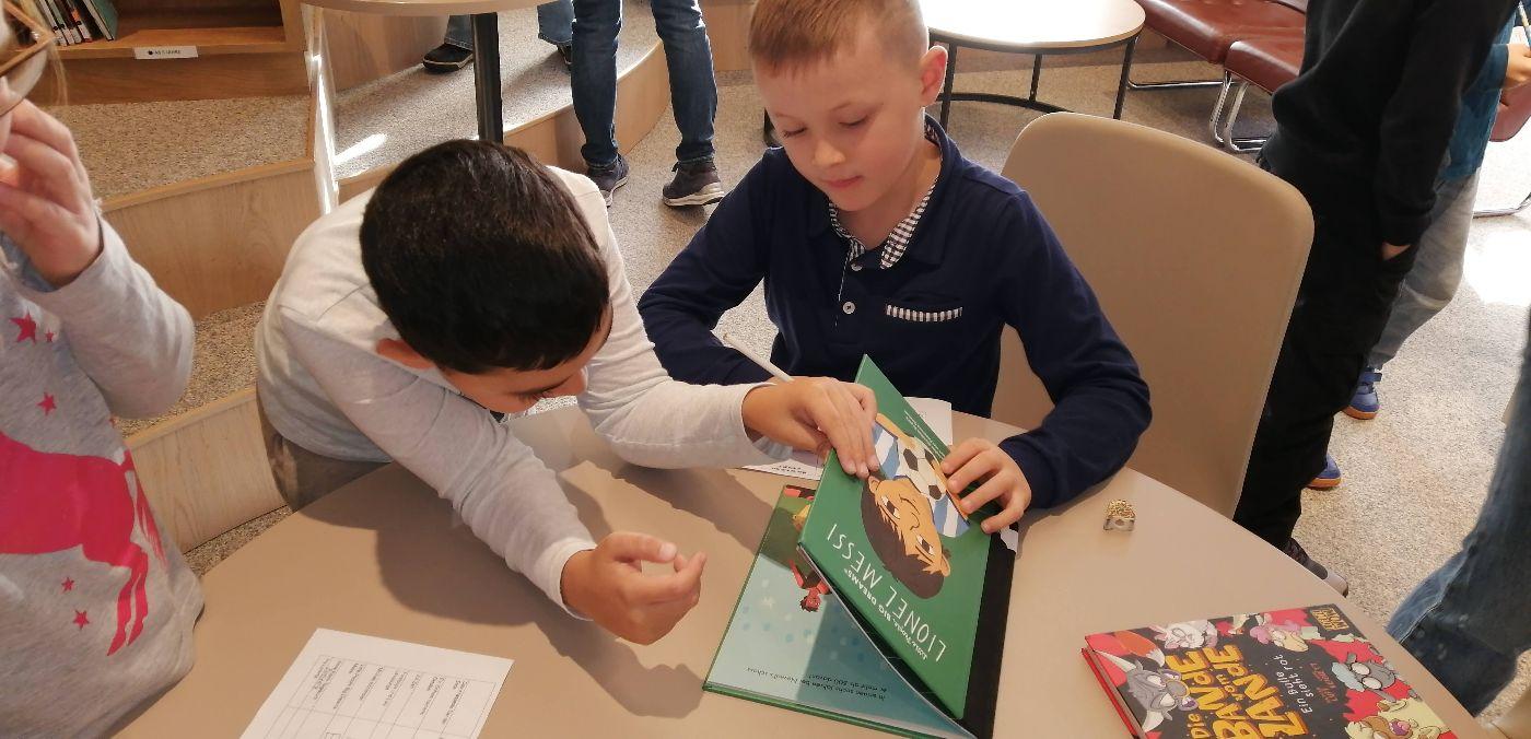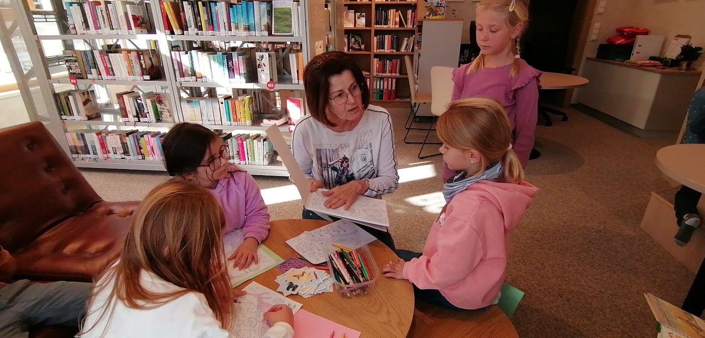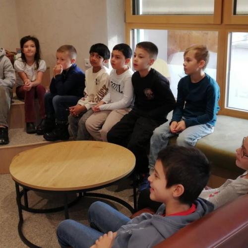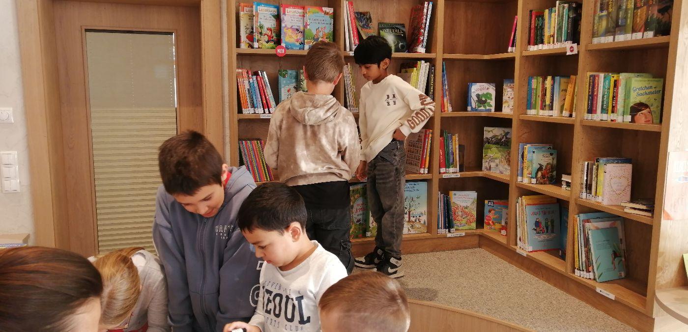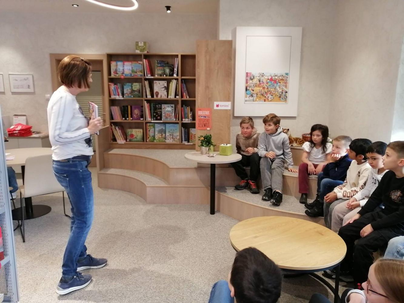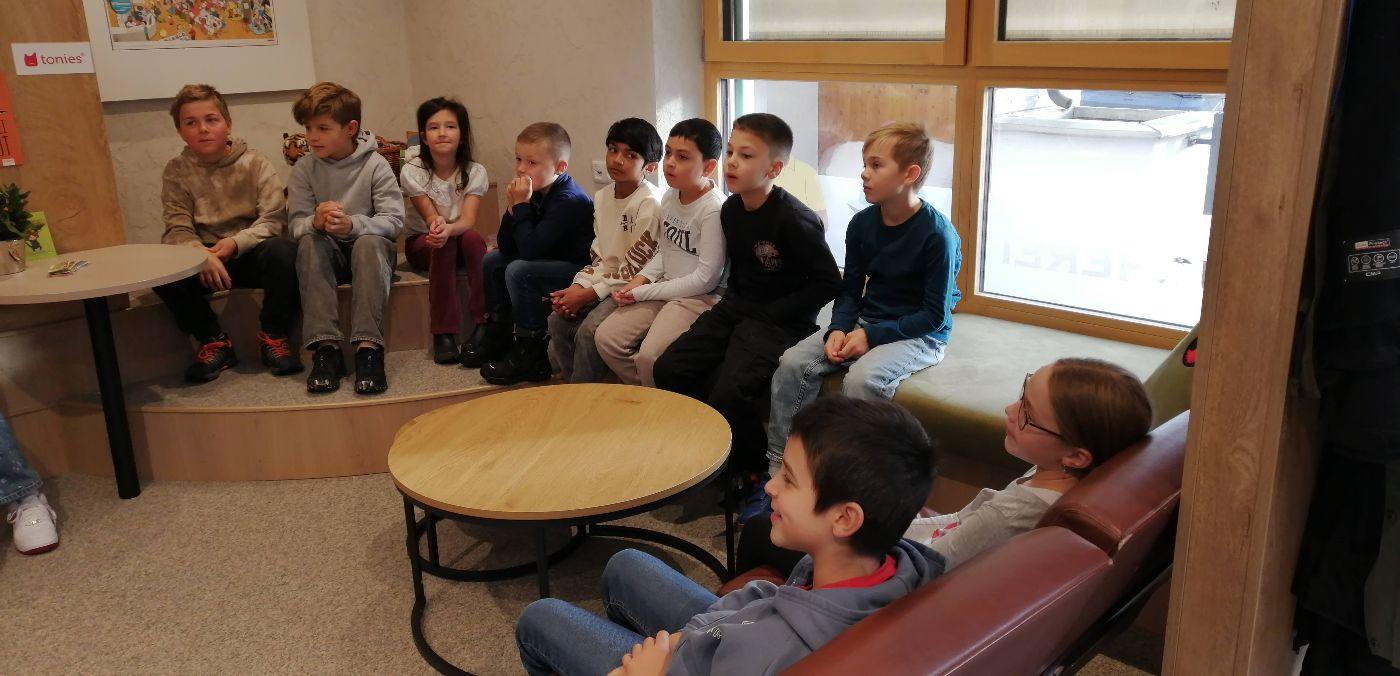 Da wir richtige Bücherwürmer sind, machten wir uns am ersten Tag nach den Herbstferien auf, um der Einladung von Angela und Sabrina in die Gemeindebücherei zu folgen.