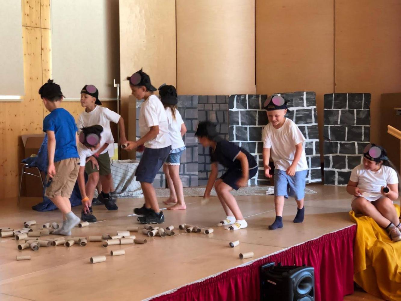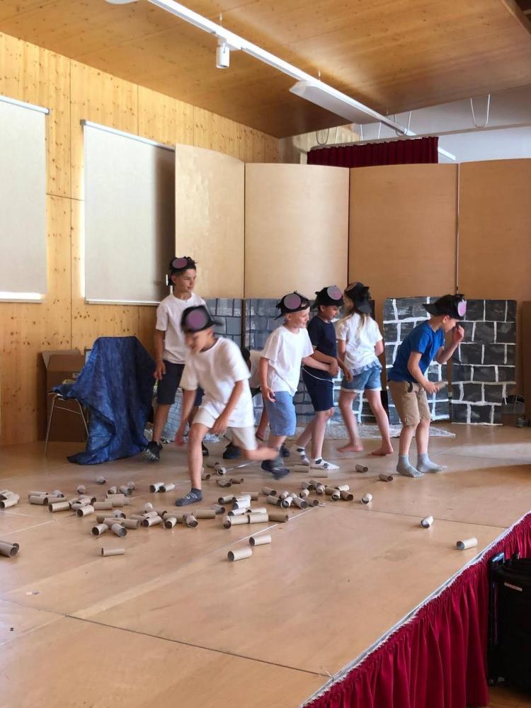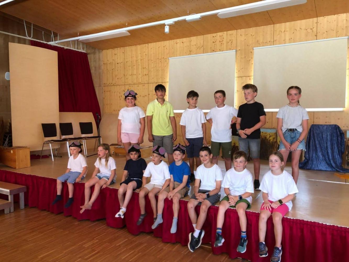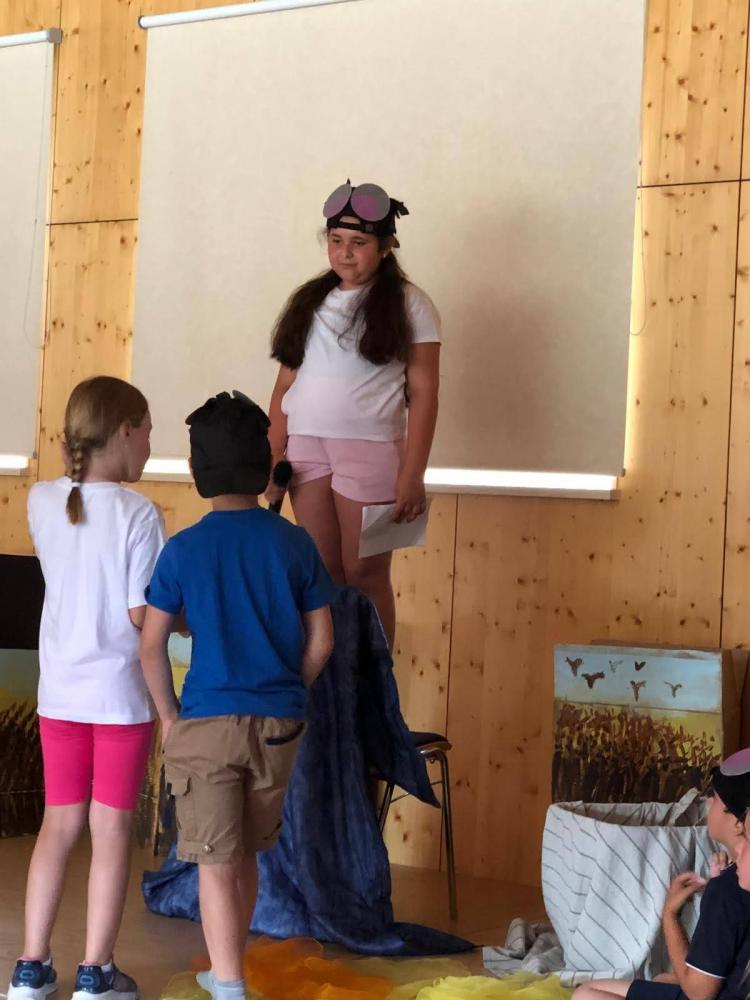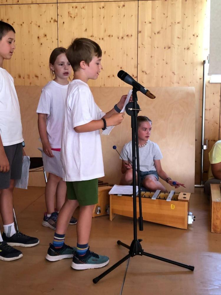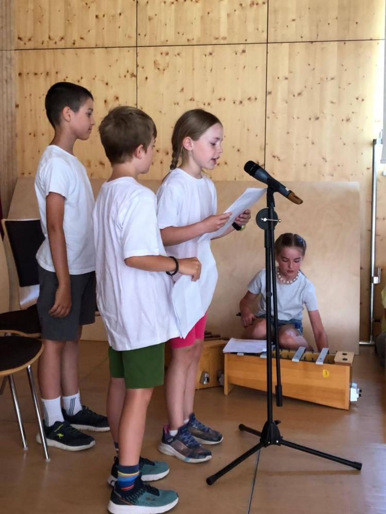 Während des Schuljahres studierten wir zwei Volkstänze ein, die wir nach einem Auftanz auf der Bühne im Gemeindesaal präsentierten. Anschließend bauten wir die Bühne um und erzählten die Geschichte von "Frederick", der Maus (nach dem Buch von Leo Leonni) als Singspiel. Zum Abschluss sangen wir zwei Lieblingslieder aus dem vergangenen Schuljahr: "Anders als du" und den Mango-Mango-Früchte-Kanon, wobei das Publikum hier ganz motiviert mitgemacht hat. Es war uns eine Freude!
