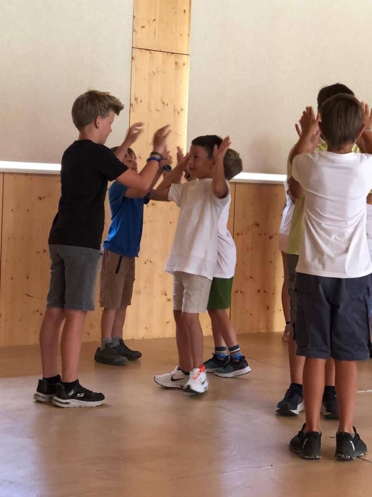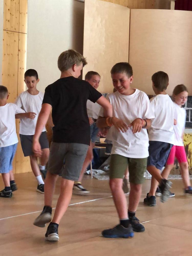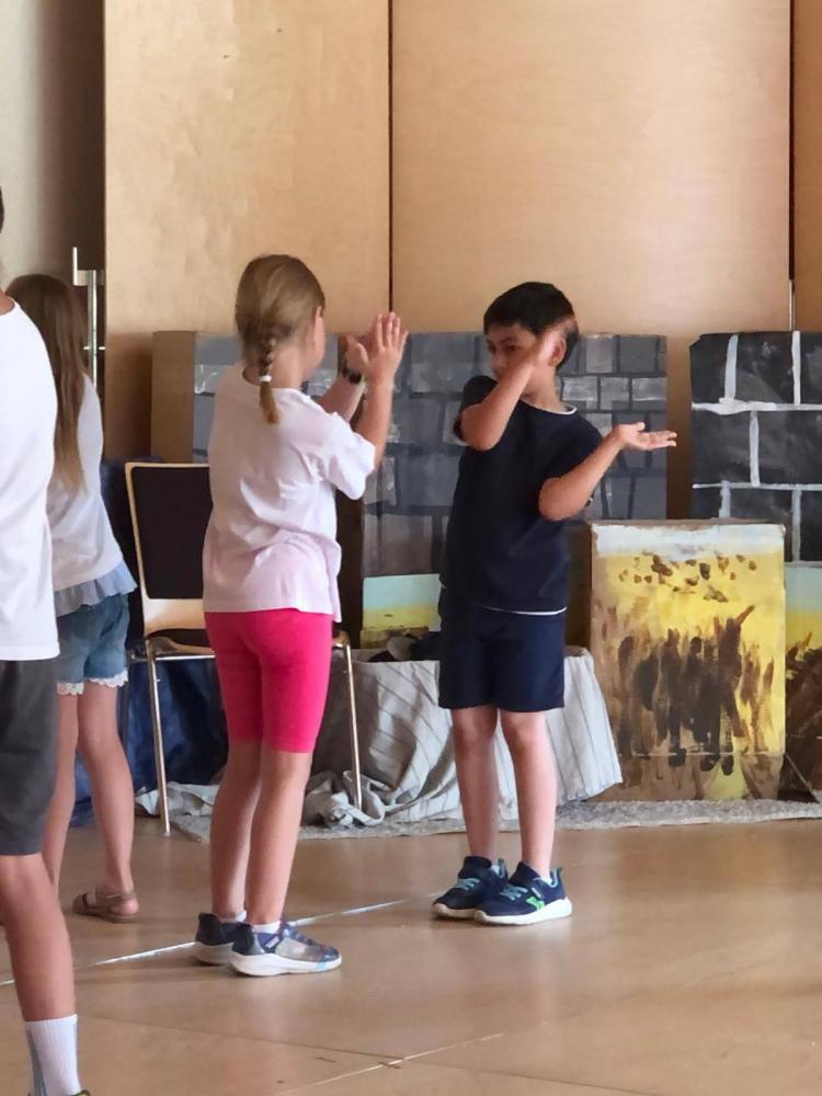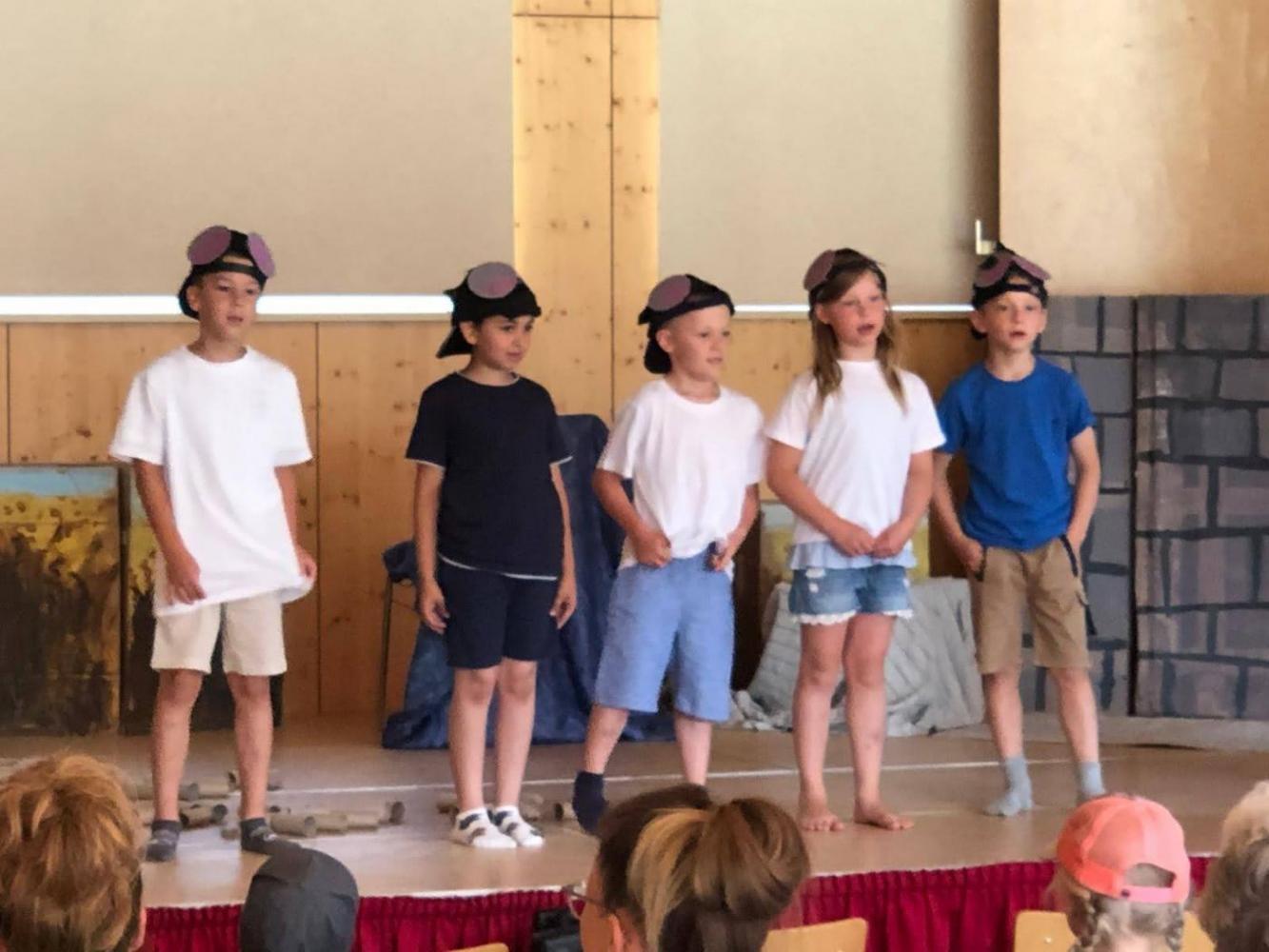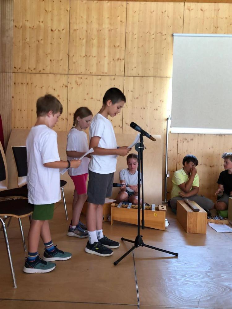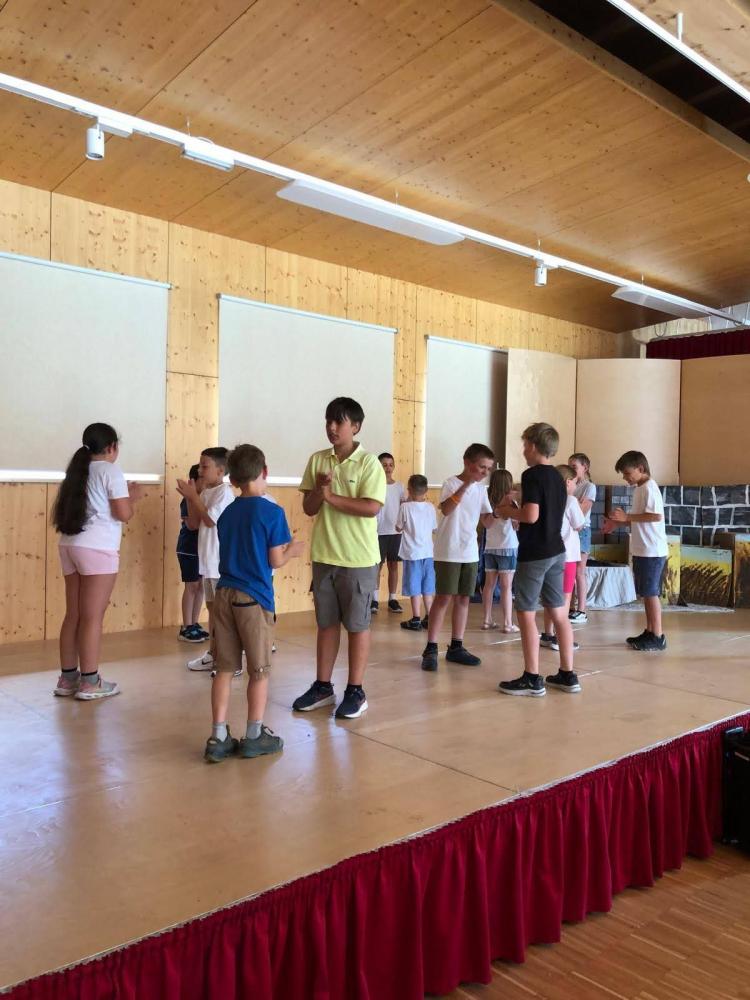 Während des Schuljahres studierten wir zwei Volkstänze ein, die wir nach einem Auftanz auf der Bühne im Gemeindesaal präsentierten. Anschließend bauten wir die Bühne um und erzählten die Geschichte von "Frederick", der Maus (nach dem Buch von Leo Leonni) als Singspiel. Zum Abschluss sangen wir zwei Lieblingslieder aus dem vergangenen Schuljahr: "Anders als du" und den Mango-Mango-Früchte-Kanon, wobei das Publikum hier ganz motiviert mitgemacht hat. Es war uns eine Freude!
