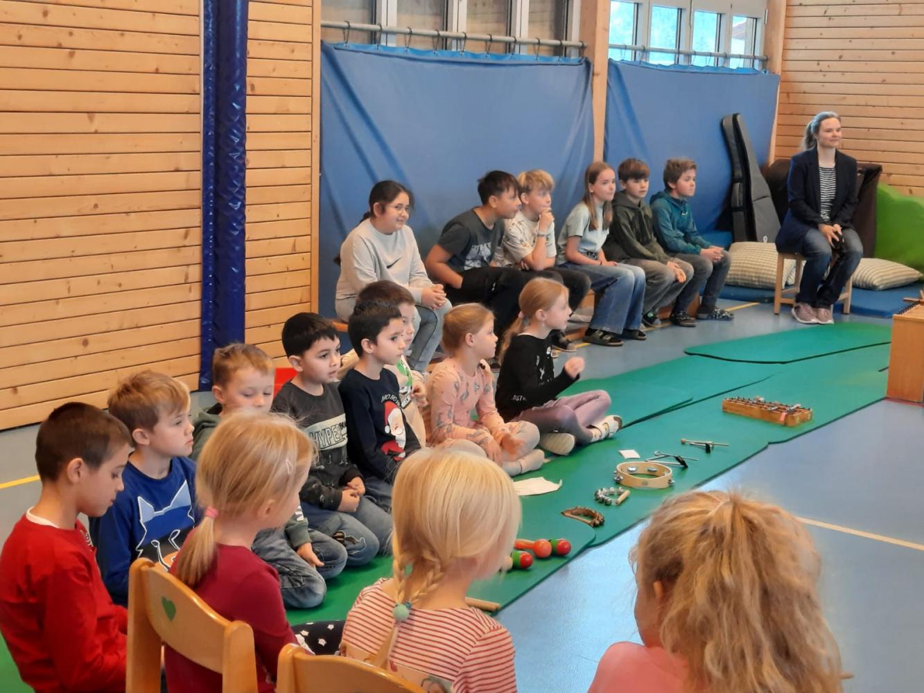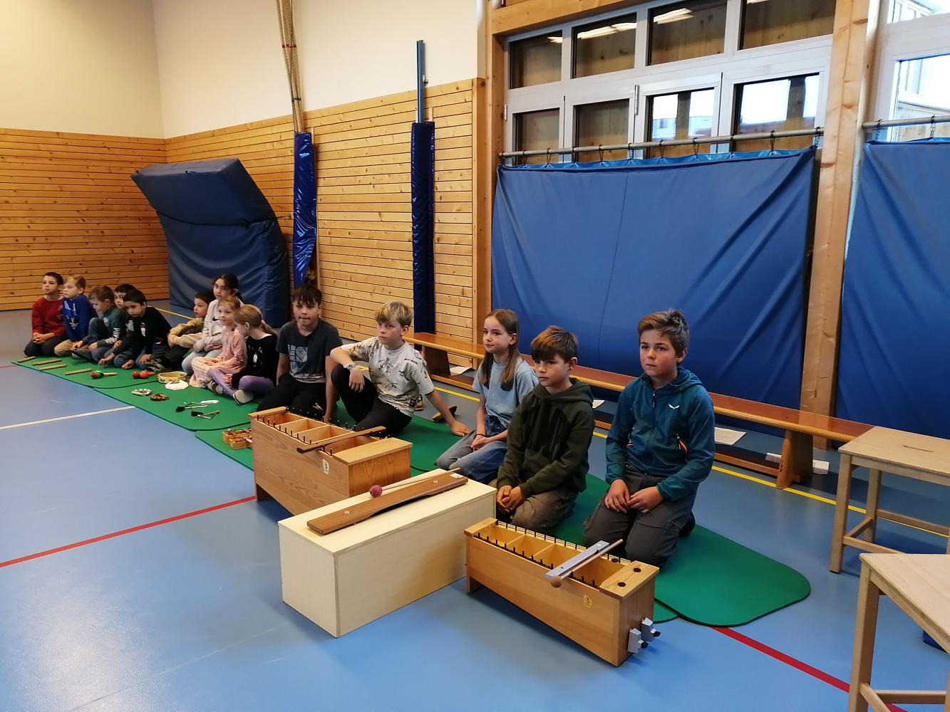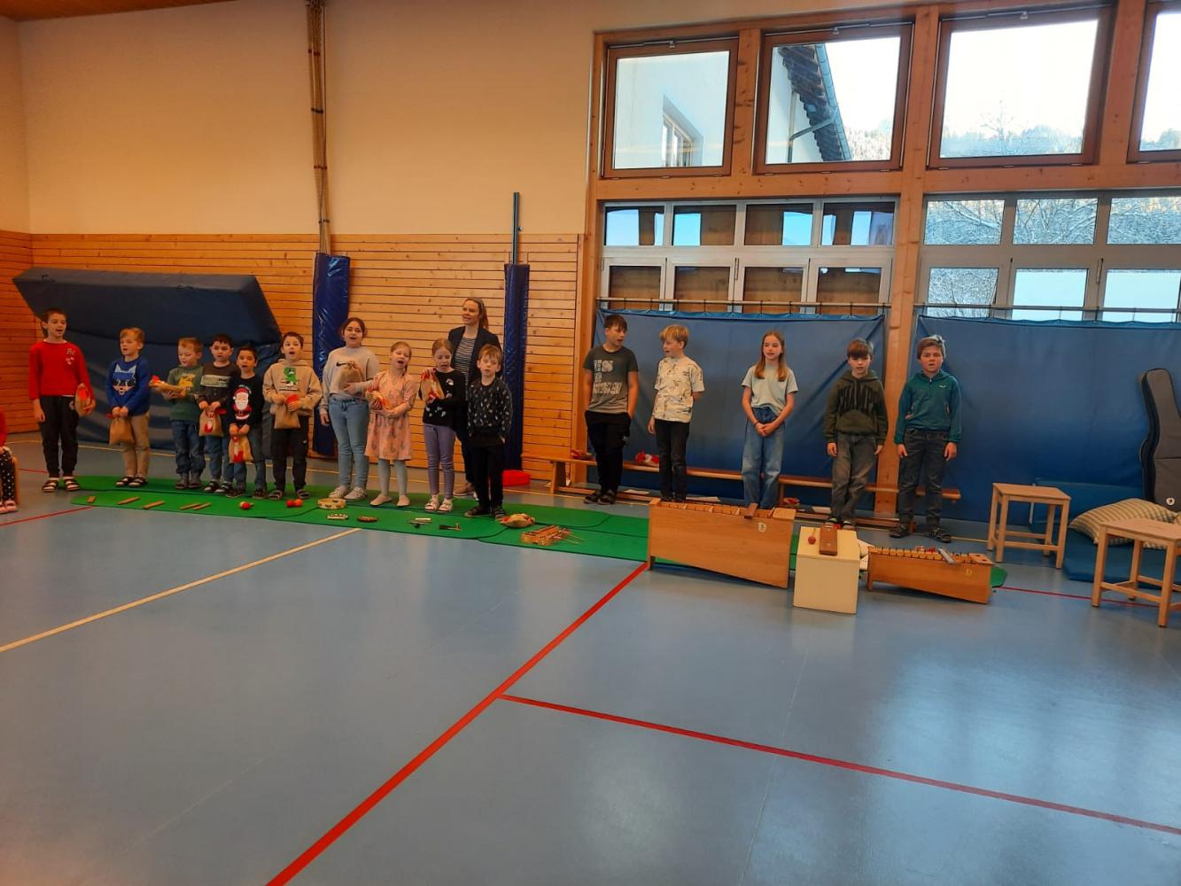 Gleich danach traf der Nikolaus in Begleitung zweier Engel im Turnsaal ein und wurden musikalisch begrüßt. Der schöne Gesang der Kindergartenkinder wurde musikalisch von ihren Pädagoginnen bei mit der Harfe und Gitarre begleitet und die Volksschulkinder spielten später selbst mit Orff-Instrumenten und sangen zum Nikolauslied "Ich hör ihn" begeistert mit.