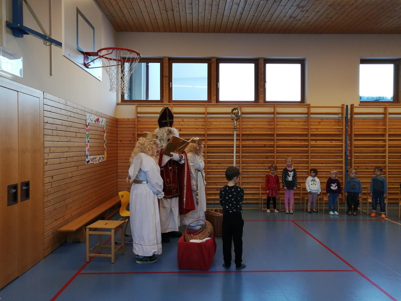 Nikolaus las aus seinem goldenen Buch vor und hatte für alle Kinder ein kleines Geschenk dabei. Zudem hab es für die Schulbibliothek neue Bücher zum Lesen und Vorlesen, sodass auch die Kleinsten etwas davon haben.