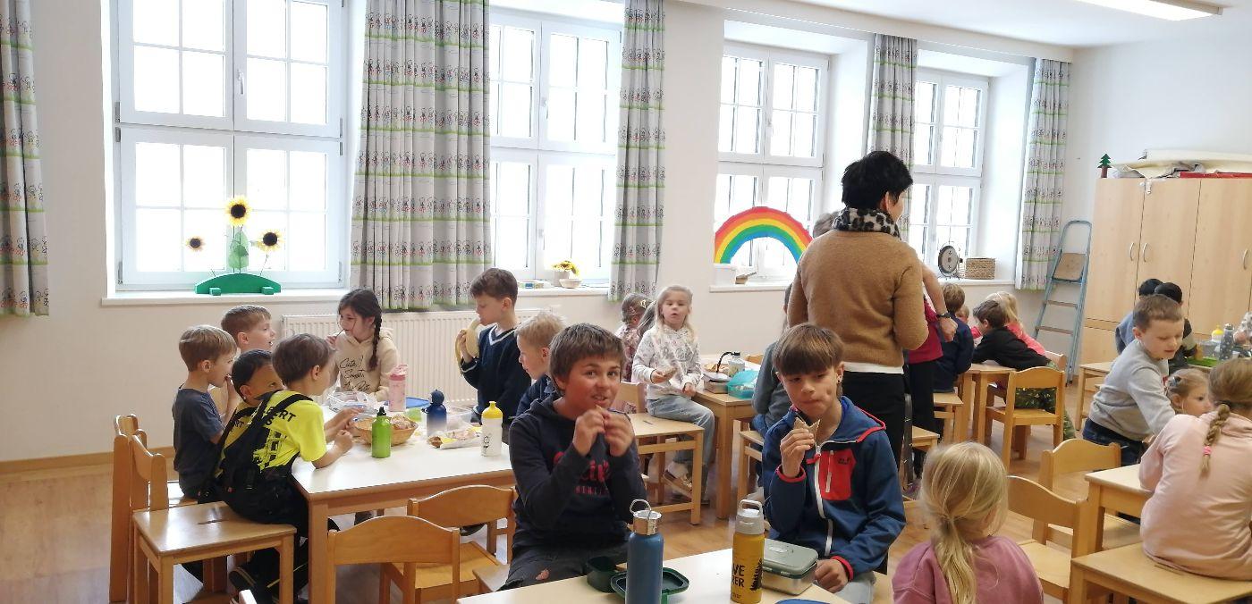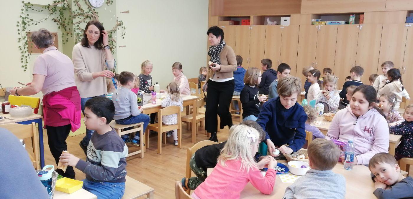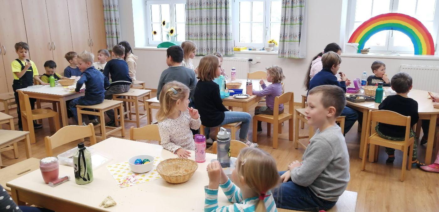 Am letzten Tag vor den Osterferien verabredeten wir uns im Kindergarten zu einer gemeinsamen Jause. Es gab Ostereier, Brot mit Butter und/oder Marmelade, kleine Schokoeier und sogar ein leckeres Osterlamm. Danke an Verena, Petra und Tanja für die Einladung!