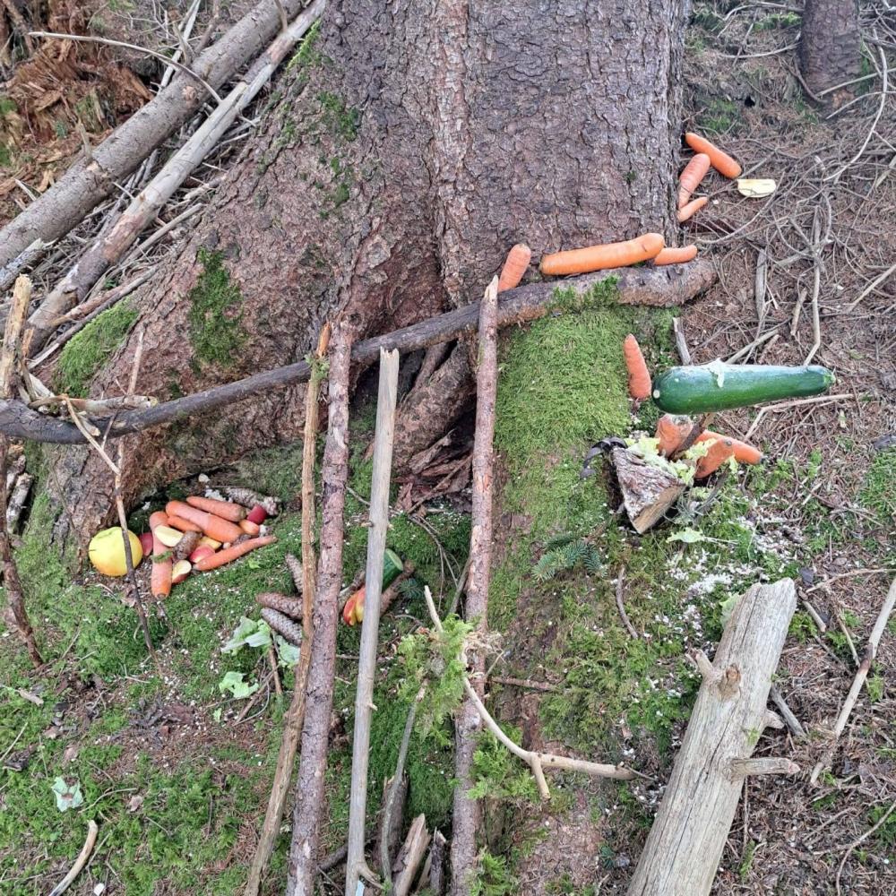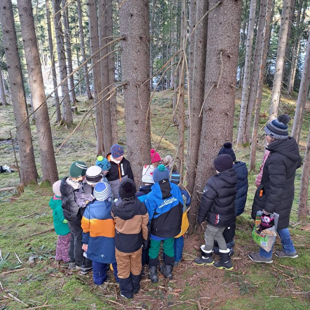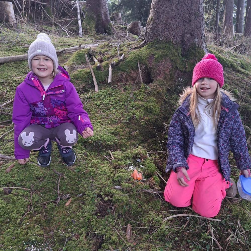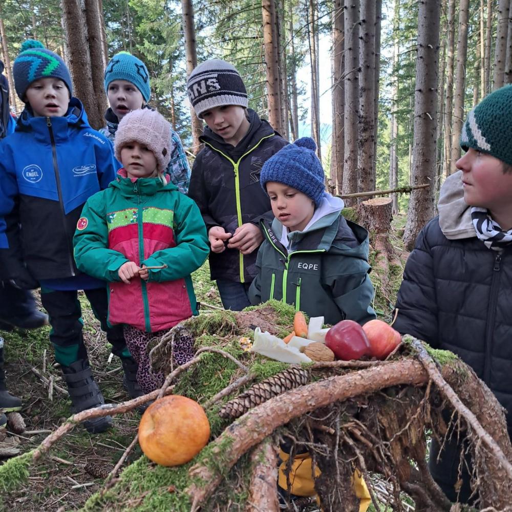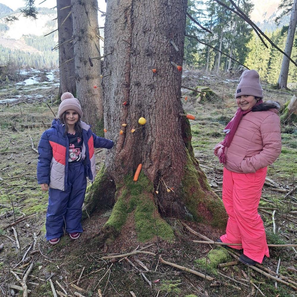 Die Kinder brachten am 23.12. von zuhause Heu, Nüsse, Getreide, Karotten, Äpfel und ähnliche Leckereien für unsere Waldbewohner mit. Nach der Pause machten wir uns auf den Weg und wanderten gemütlich in den Wald. Dort gestalteten die Kinder dann in Kleingruppen an verschiedenen Stellen Futterstellen und -verstecke. Das war ein toller vorweihnachtlicher Ausflug.