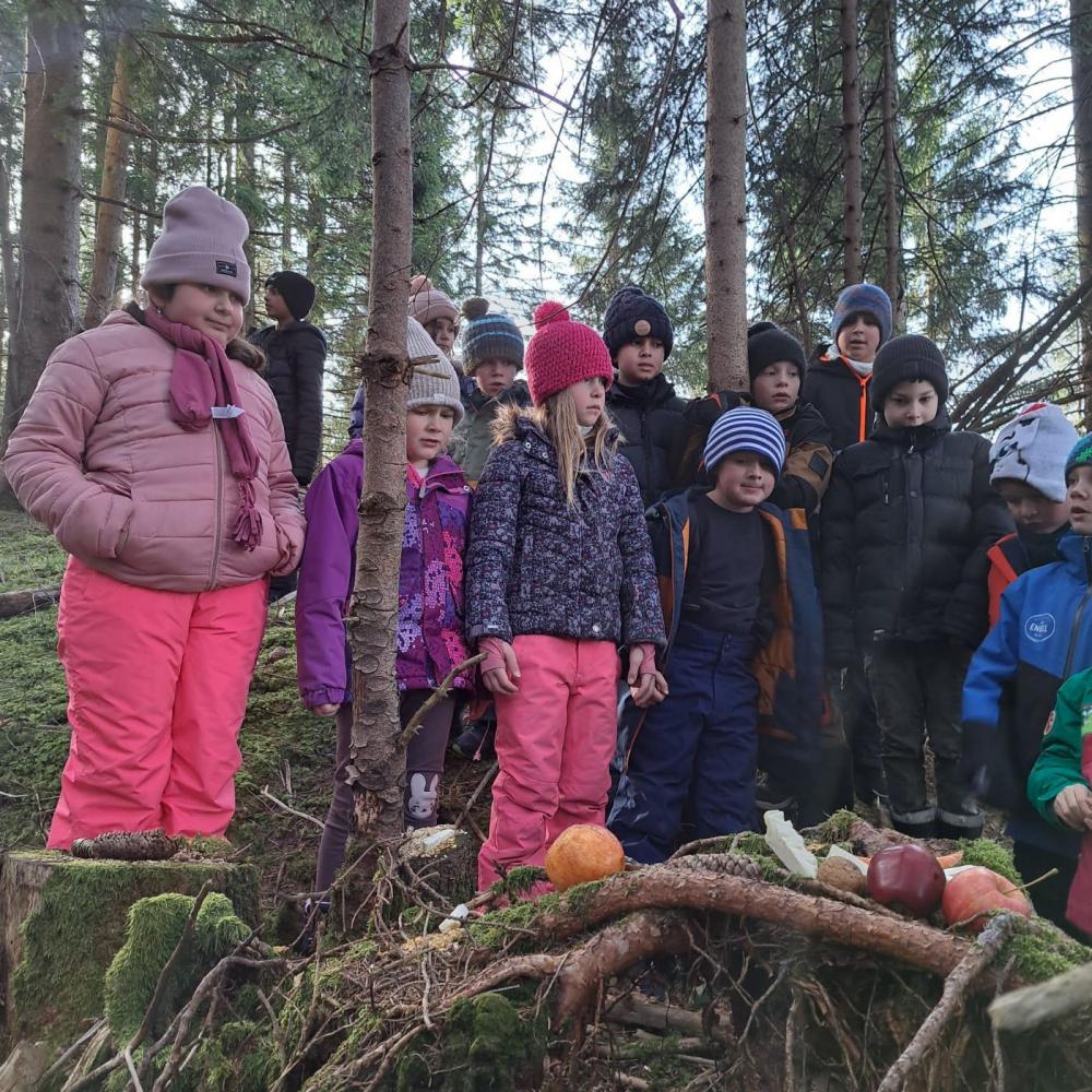 Wie auch im letzten Jahr begaben wir uns am letzten Schultag vor den Weihnachtsferien in den nahe gelegenen Wald oberhalb der Burgschenke, um den Waldtieren ein paar Futternester zu bereiten.